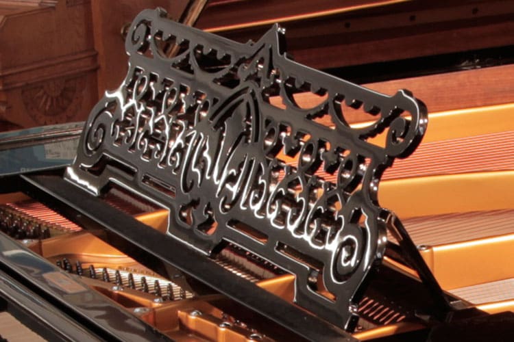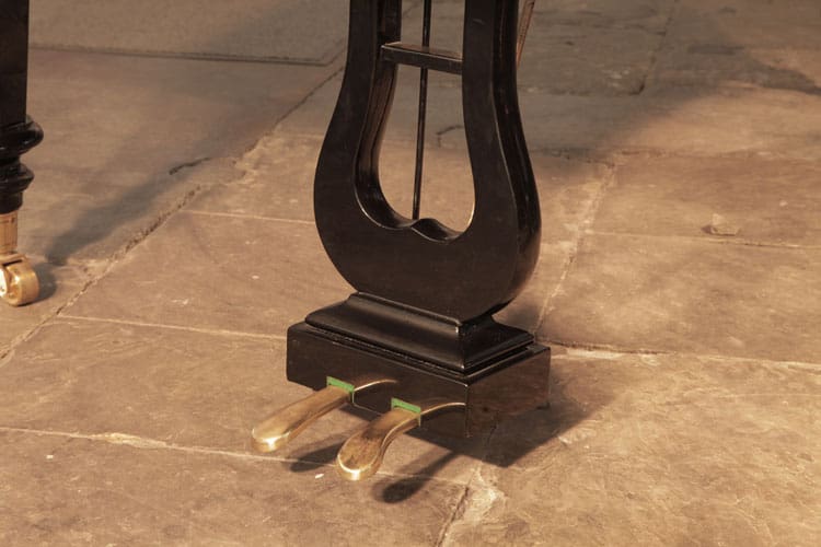 Die Musikablage besticht durch ein offenes arabesken Design mit durchbrochenen Ornamenten, Schwüngen und einem zentralen Anthemion, das dem Klavier einen einzigartigen Charakter verleiht. Die gedrehten, facettierten Beine sorgen für Stabilität und verleihen dem Flügel eine klassische Anmutung, während die traditionell geformte Klavier-Lyre mit zwei Messingpedalen sowohl Funktionalität als auch Stil bietet.