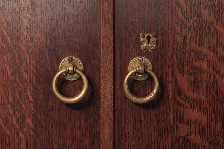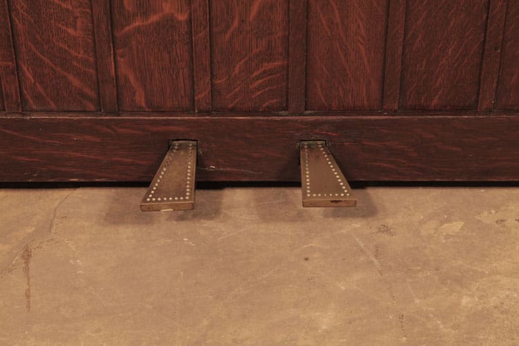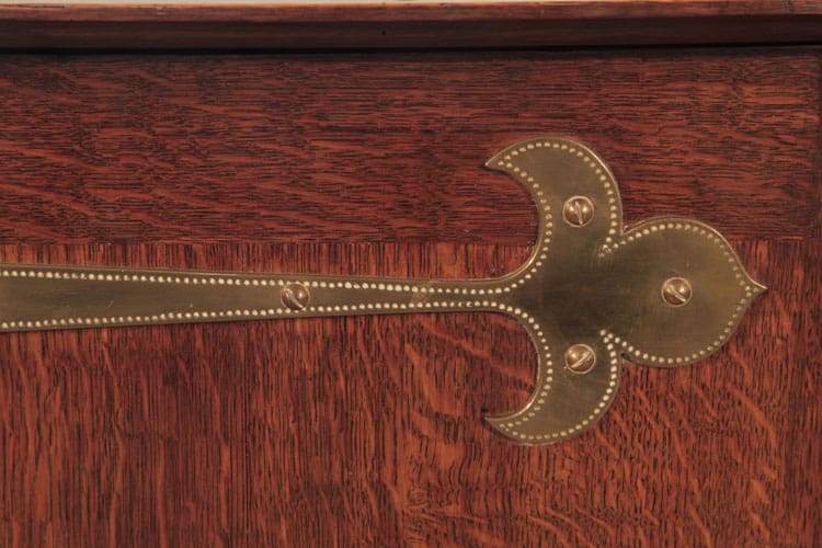 Das Klavier kommt in einem eleganten Eichenholzgehäuse, das an eine alte Truhe auf einem Stand erinnert. Das Gehäuse ist vollständig um das Instrument geschlossen und bietet eine faszinierende Erscheinung, die an eine Elizabethanische Truhe erinnert. Mit seinen verzierten Messingbändern und den floralen Fleur-de-lis Motiven strahlt es einen Hauch von historischem Charme aus. Die zwei runden Messinggriffe und das kunstvoll gestaltete Schlüsselblech aus Messing fügen zusätzliche Details hinzu, die die Handwerkskunst unterstreichen.