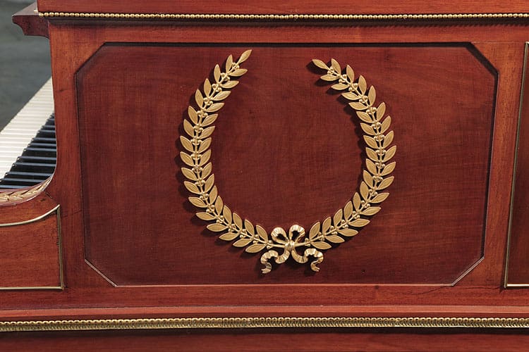 Besonders auffällig ist das offene Notenpult, das mit stilisierten Palmetten, Wellen und Blumen verziert ist, wobei eine zentrale Lyra von Lorbeerblättern umrahmt wird. Die Klavierwangen sind mit Ormolu-Absetzungen und einem zentralen Lorbeerkranz sowie einer Schleife geschmückt, was die Handwerkskunst des Herstellers unterstreicht. Die quadratischen Torbeine sind kunstvoll mit Akanthusmotiven geschnitzt und ebenfalls mit Ormolu-Beschlägen versehen.