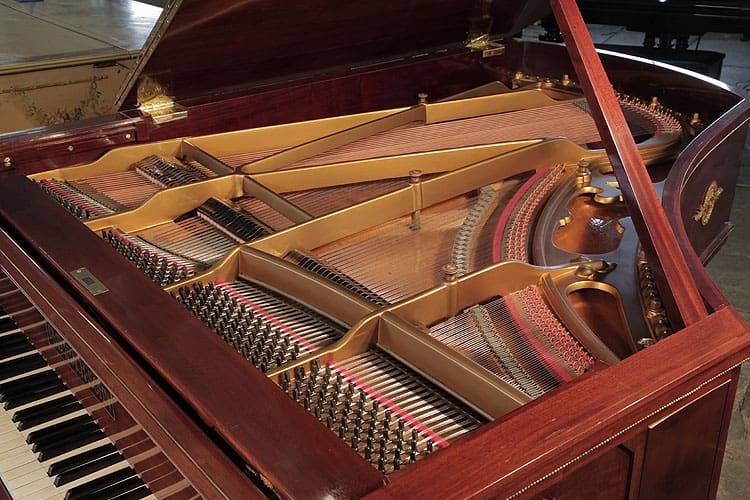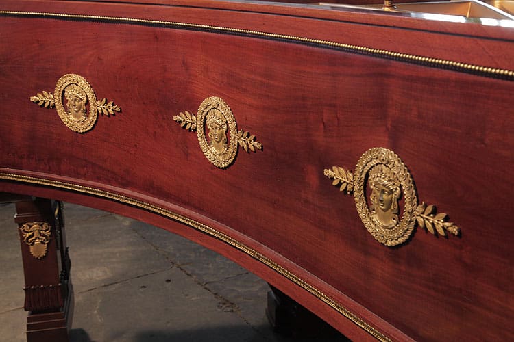 Das Empire Stil Klavier zeichnet sich durch reichhaltige Ormolu-Verzierungen, ein offenes Notenpult mit kunstvollen Schnitzereien und eine elegante Mahagonikonstruktion aus.