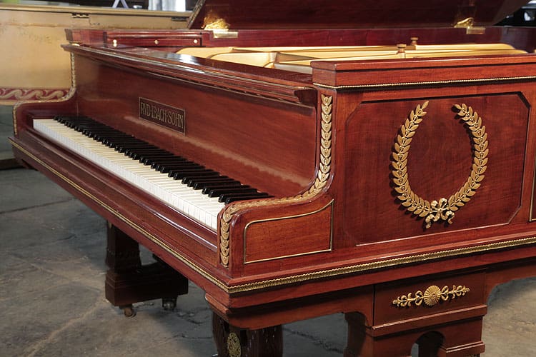 Das exquisite Empire Stil Klavier aus dem Jahr 1901, Modell 2 von Ibach, ist ein wahres Meisterwerk der Klavierbaukunst. Mit seinem eleganten Mahagonigehäuse und den kunstvoll gestalteten Torbeinen verkörpert dieses Klavier den Inbegriff klassischer Eleganz. Die gesamte Kabine ist reich verziert mit feinen Ormolu-Beschlägen, die Szenen von griechischen Göttern und Göttinnen sowie prächtigen Lorbeerkränzen darstellen. Diese detailreiche Ausstattung macht das Klavier nicht nur zu einem fantastischen Musikinstrument, sondern auch zu einem beeindruckenden Kunstobjekt, das in jedem Raum zur Geltung kommt.