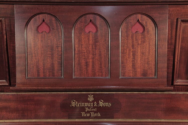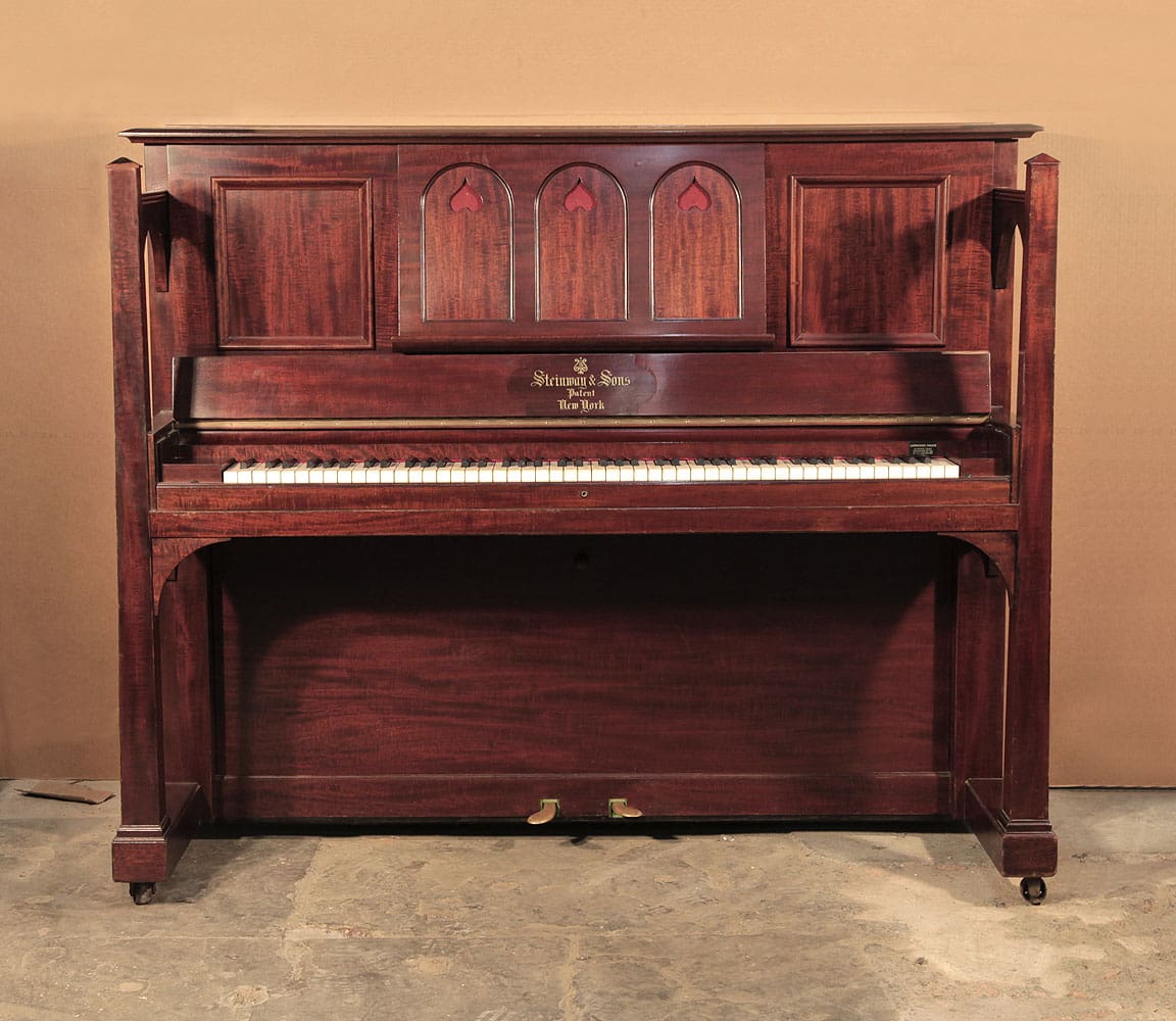 Steinway Vertegrand Klavier, Baujahr 1905 | Mahagoniholz mit figuriertem Gehäuse | 88-Tasten-Keyboard mit zwei Pedalen | Arts and Crafts Stil | In gutem Zustand mit architektonischen Füßen und breitem Notenpult