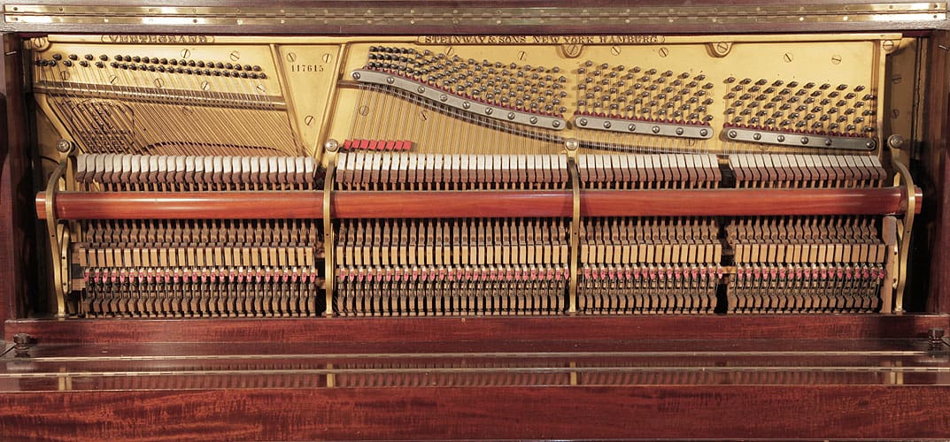 Das Steinway Vertegrand Klavier ist ein herausragendes Beispiel für die exquisite Handwerkskunst und das zeitlose Design, das für die Marke Steinway & Sons steht. Dieses aufrecht stehende Klavier aus dem Jahr 1905 verkörpert den Arts and Crafts Stil und überzeugt durch sein elegantes, gefertigtes Mahagonigehäuse. Die markanten, architektonischen Beine mit einem gewölbten Architrav sind bereits beim Anblick des Klaviers ein echter Blickfang und unterstreichen die hohe Qualität und das ästhetische Empfinden, das in jedes Detail eingeflossen ist.
